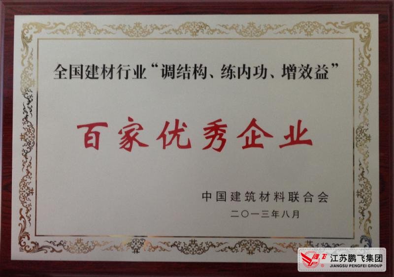 為樹立典型,有效遏制經(jīng)濟(jì)效益下滑,推進(jìn)建材行業(yè)調(diào)整結(jié)構(gòu)和轉(zhuǎn)型升級,弘揚(yáng)正能量,發(fā)揮優(yōu)秀企業(yè)的典型示范作用,促進(jìn)行業(yè)科學(xué)發(fā)展,中國建材聯(lián)合會(huì)與各省市地方建材行業(yè)協(xié)會(huì)聯(lián)手開展推薦表彰“調(diào)結(jié)構(gòu)、練內(nèi)功、增效益”百家優(yōu)秀企業(yè)評比表彰活動(dòng)。江蘇鵬飛集團(tuán)強(qiáng)抓市場機(jī)遇,堅(jiān)持科學(xué)發(fā)展之路,創(chuàng)新經(jīng)營模式,被授予“調(diào)結(jié)構(gòu)、練內(nèi)功、增效益”百家優(yōu)秀企業(yè)榮譽(yù)稱號。
