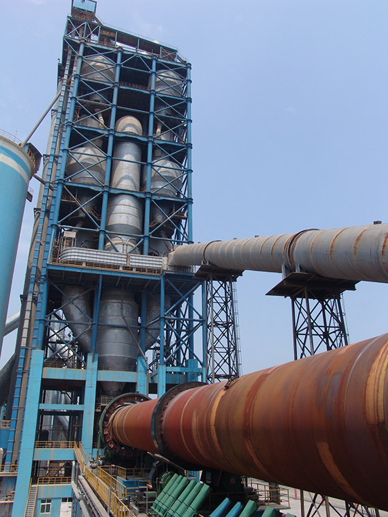回轉(zhuǎn)窯是由鋼板卷制的圓筒,內(nèi)砌耐火磚,由裝車簡(jiǎn)體上的輪帶和下面的托輪支承,用裝在窯身上的大齒圈傳動(dòng)。回轉(zhuǎn)窯通常以3.5%的斜度安放,轉(zhuǎn)數(shù)一般在1轉(zhuǎn)/分鐘以內(nèi)、新式干法窯可達(dá)3轉(zhuǎn)/分鐘以上。單筒冷卻機(jī)與窯相似,不同的是筒內(nèi)裝有揚(yáng)料板用以加速熟料冷卻。窯頭高溫區(qū)簡(jiǎn)體溫度過(guò)高,以前曾用水冷卻,現(xiàn)已改為用風(fēng)冷卻。