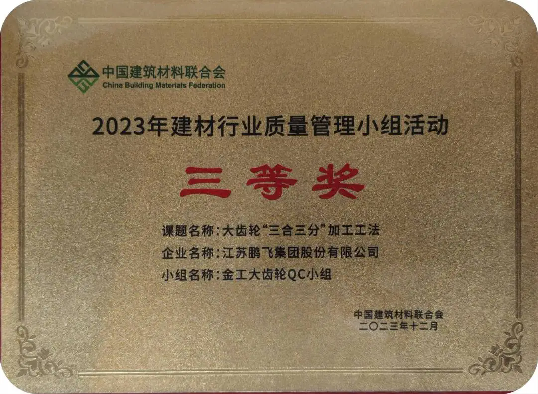 近期,中國建筑材料聯(lián)合會組織召開第三十九次建材行業(yè)質量管理小組代表大會暨質量信得過班組經驗交流大會,會上頒發(fā)了2023年建材行業(yè)優(yōu)秀質量管理小組和質量信得過班組、先進個人和優(yōu)秀組織榮譽證書。鵬飛金工大齒輪“三合三分”加工工法獲得“2023年建材行業(yè)優(yōu)秀質量管理小組三等獎”;輥壓機二組QC小組的輥壓機鑄釘輥制造工藝研究與改進獲得“2023年建材行業(yè)優(yōu)秀質量管理小組優(yōu)秀獎”,同時QC小組獲評“我最喜愛的質量管理小組”。
