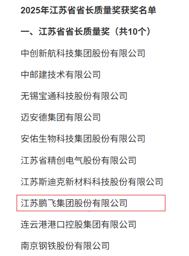 2月27日,2025年度江蘇省省長質(zhì)量獎頒獎儀式在南京舉行,省長劉小濤為獲獎企業(yè)頒獎,充分肯定企業(yè)在質(zhì)量領域的深耕與卓越追求。江蘇鵬飛集團股份有限公司作為獲獎企業(yè)之一,董事長王家安上臺領獎。