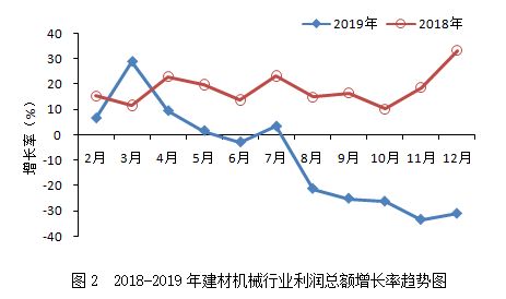 2019年,建材機械行業(yè)累計實現(xiàn)利潤總額36.57億元,同比下降31.00%,增速較上年同期回落64.26個百分點,落后于建材工業(yè)(15.6%)、機械工業(yè)(-4.53%)的增速,遠低于建材機械相關(guān)領(lǐng)域工程機械(16.48%)、重型礦山機械(21.65%)增速。從增速變化趨勢看(見圖2),全年利潤總額增速下行態(tài)勢明顯,且與上年相比回落較大,降幅最高達64.26個百分點。
