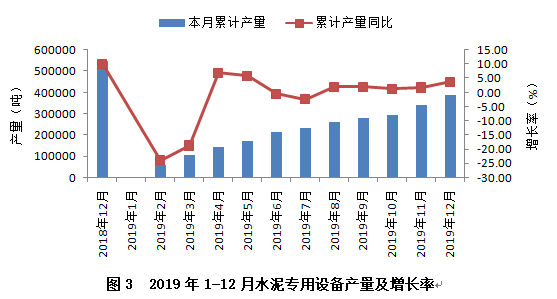 從行業(yè)重點監(jiān)測的產(chǎn)品看,水泥專用設(shè)備產(chǎn)量實現(xiàn)小幅增長,2019年累計完成38.65萬噸,同比增長3.69%,較上年同期下降6.37個百分點。從全年產(chǎn)量增速變化趨勢看(見圖3),上半年波動較大,下半年逐步趨緩、趨穩(wěn)。