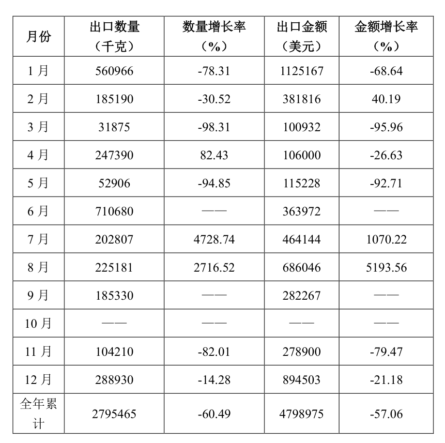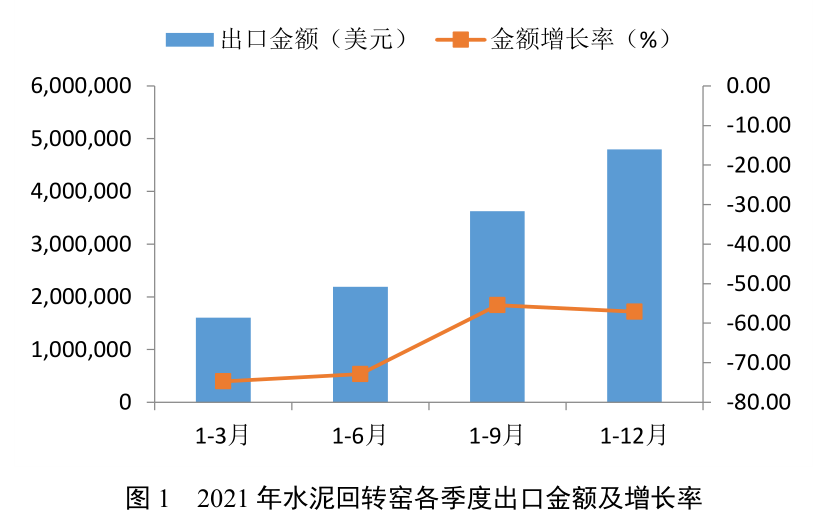 表1 2021年水泥回轉窯出口數量、金額及增長率