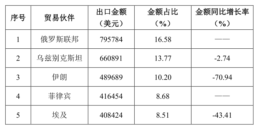 表2 2021年水泥回轉窯主要出口國家或地區(qū)情況