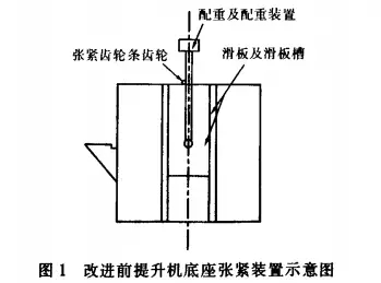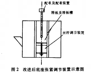 原來設(shè)計(jì)的配重裝置采用兩邊齒條,通過配重和下滾筒的自重進(jìn)行皮帶張緊,兩邊調(diào)節(jié)裝置同時(shí)調(diào)節(jié)皮帶的跑偏情況。從理論上講沒有問題,但實(shí)際使用中皮帶兩邊跑偏嚴(yán)重,無法進(jìn)行調(diào)整,增大配重或偏向提升或下沉齒條都無法解決問題。經(jīng)研究分析,我們將配重連接M32的絲桿,在導(dǎo)向板的下半部分設(shè)置調(diào)節(jié)裝置,解決了問題。改進(jìn)前后見圖1、圖2。