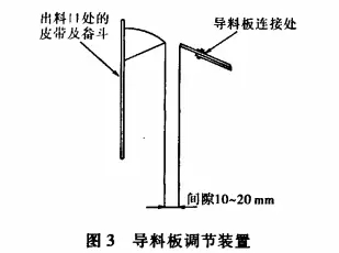 由圖3可見,間隙應(yīng)調(diào)整在10-20mm,不能太大,也不能太小。間隙太小,機(jī)組運(yùn)行時(shí),畚斗與導(dǎo)料板相碰,無法運(yùn)行。間隙太大,則回料太多,導(dǎo)致機(jī)組箱體內(nèi)堵料而停車。導(dǎo)料板系易損件,平時(shí)應(yīng)經(jīng)常檢查導(dǎo)料板的磨損情況,做到及時(shí)更換,并保證安裝牢固。