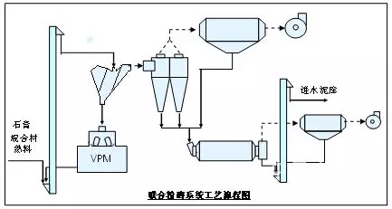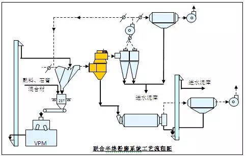 此工藝運用于VPM立磨功率與球磨機功率比值大于0.5的場合,該系統(tǒng)主要優(yōu)點是系統(tǒng)產(chǎn)量高(增產(chǎn)100%以上),單位電耗低。