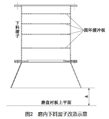 一方面它降低了入磨物料高落差對溜子的沖刷,另一方面圓環(huán)的收口作用使得物料的下料點(diǎn)發(fā)生了變化,將原先的單點(diǎn)偏心下料改成接近中心下料,改善了物料在磨盤上的偏離現(xiàn)象。同時,適當(dāng)調(diào)整h值的大?。ㄔO(shè)計600mm,最終改為400mm),使得下料波動時,可以起到一定的緩沖作用,穩(wěn)定料床。