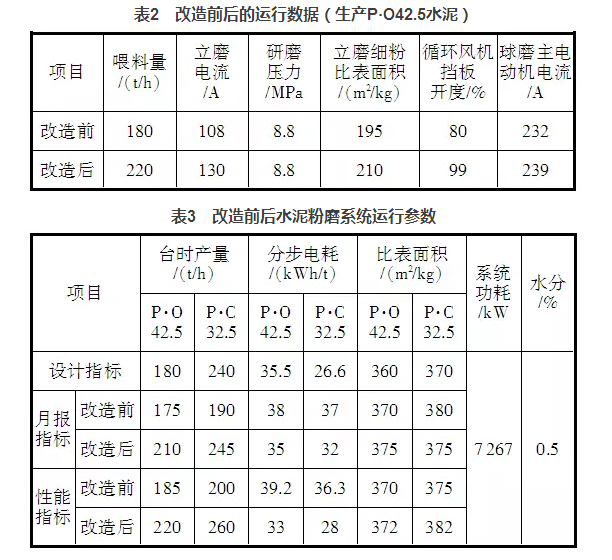 通過以上幾個方面的整改,水泥粉磨系統(tǒng)的臺時產(chǎn)量有了明顯提升,表2是改造前后的運(yùn)行數(shù)據(jù),表3是水泥粉磨系統(tǒng)改造前后操作參數(shù)對照。
