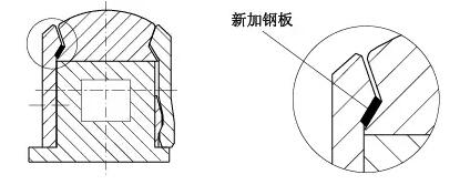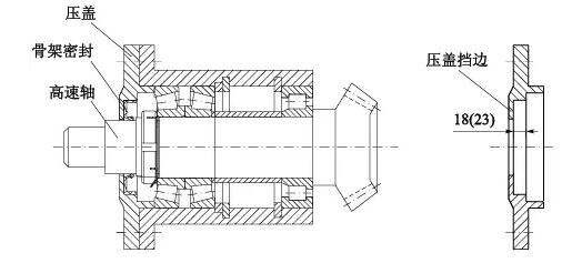 骨架密封厚度15mm,拆下壓蓋用車床將骨架密封擋邊車薄5mm,壓蓋密封槽深度由18mm加深到23mm(見圖4)。此法使得骨架密封在高速軸上的安裝位置向外移動5mm,避開高速軸上的溝槽。經(jīng)此處理,解決了漏油問題,可以正常生產(chǎn),等到計劃檢修停機時,再徹底處理高速軸上的溝槽。