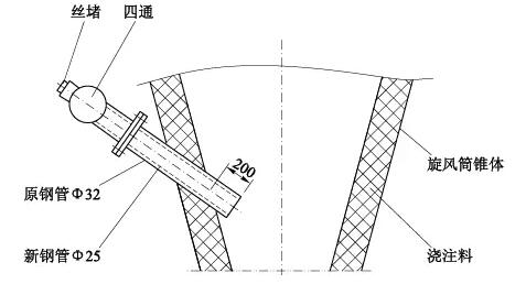 拆下四通及法蘭,在Φ32鋼管內(nèi)部套裝Φ25鋼管,Φ25鋼管上端與法蘭焊接,下端與原Φ32筒平齊(見圖5)。這樣處理后,預(yù)熱器C5B旋風(fēng)筒負壓正常。
