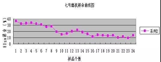 鑒于六七號(hào)磨機(jī)的狀況,我們對(duì)兩臺(tái)磨機(jī)停磨進(jìn)磨觀察,六號(hào)磨機(jī)內(nèi)兩倉(cāng)料球比過(guò)高,進(jìn)磨后看不到鋼球,物料高出一個(gè)鋼球的高度,正常情況下鋼球應(yīng)該高出料面露出半個(gè)鋼球?yàn)樽罴?,隨現(xiàn)場(chǎng)測(cè)量計(jì)算六號(hào)磨一倉(cāng)填充率為28.7%二倉(cāng)為29.0%;七號(hào)磨機(jī)進(jìn)磨觀察一倉(cāng)鋼球露出料面一半,說(shuō)明填充率應(yīng)該是可以的,測(cè)量計(jì)算一倉(cāng)的填充率為31.2%二倉(cāng)為29.2%;這種磨機(jī)的最佳填充率一倉(cāng)為30%左右二倉(cāng)為31%左右。隨取七號(hào)磨樣做了磨機(jī)的篩余曲線,磨機(jī)均采用急停的停磨方式,入磨共取樣品24個(gè)做80um和200um的篩余。見(jiàn)圖1。