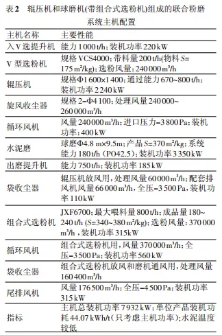 此系統(tǒng)主要由 V 型選粉機、輥壓機、旋風收塵器、球磨機和組合式選粉機組成,球磨機系統(tǒng)為閉路系統(tǒng),流程圖見圖 3,主要的主機配置見表 2。其中輥壓機系統(tǒng)設有單獨放風系統(tǒng),球磨機單獨通風與組合式選粉機放風共用一套收塵系統(tǒng)。