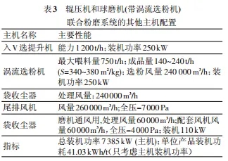 此系統(tǒng)主要由V 型選粉機、輥壓機、球磨機和渦流選粉機組成,球磨機系統(tǒng)為閉路系統(tǒng),流程見圖4。該系統(tǒng)的V 型選粉機、輥壓機、水泥磨和出磨提升機的配置及其性能完全同表 2,其他主機配置見表3。