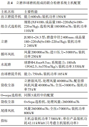 此系統(tǒng)主要由立磨、組合式選粉機、球磨機和O-Sepa 選粉機組成,球磨機系統(tǒng)為閉路系統(tǒng),流程圖見圖 5,主要的主機配置見表 4。