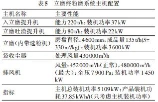 此系統(tǒng)主要由立磨、高濃度袋收塵器和風機組成,流程圖見圖 6,主要的主機配置見表 5。此系統(tǒng)其特點是:流程簡單,系統(tǒng)電耗低;廠房占地少,立磨又可以露天布置,因此土建費用相對較少;另外立磨的維修量比輥壓機要少,所以運轉率較輥壓機系統(tǒng)高。
