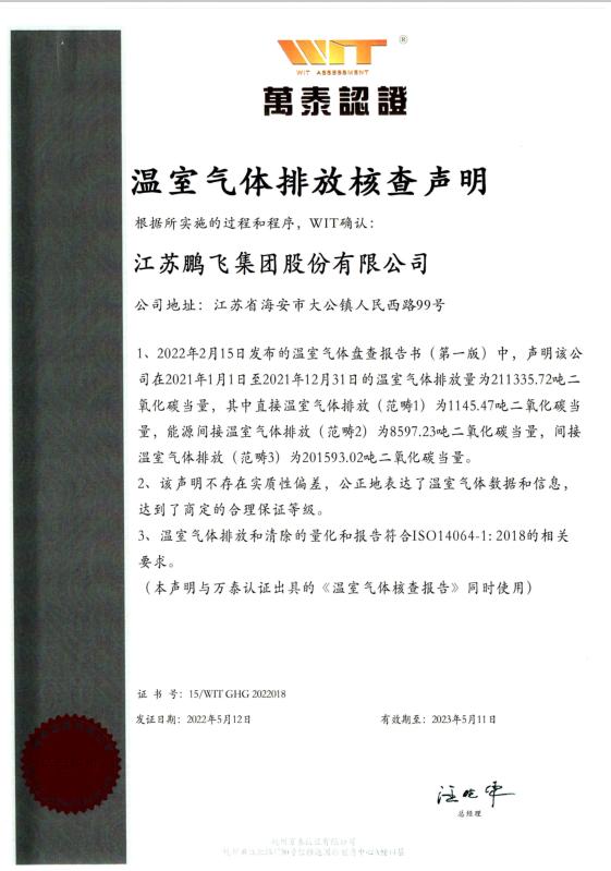 江蘇鵬飛集團(tuán)股份有限公司一直以來堅(jiān)持綠色采購,綠色生產(chǎn),綠色物流的原則,積極響應(yīng)并參與相關(guān)方(政府、客戶等)節(jié)能降排、碳排放報(bào)告活動(dòng)。