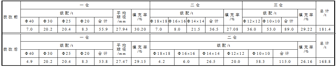 經(jīng)多次考察并做篩余曲線和顆粒級配分析后決定,將磨機二、三倉合并,原一倉倉長3.7m,二倉倉長2.7m,三倉倉長6.1m,改造后一倉倉長3.7m,二倉倉長8.8m,同時調(diào)整研磨體平均球徑及填充率,技改前后研磨體級配對比見表2。