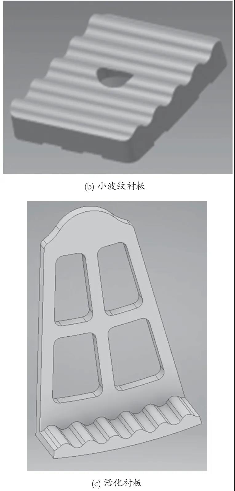 優(yōu)化前筒體襯板如圖 1 所示。一倉(cāng)采用溝槽階梯襯板,其有效長(zhǎng)度為 3.15 m,溝槽階梯襯板有磨損,階梯的高度差和溝槽可進(jìn)一步優(yōu)化;二倉(cāng)采用小波紋襯板+4 圈活化襯板,小波紋襯板厚度為 75 mm,降低了有效內(nèi)徑,增加了電耗,活化襯板磨損嚴(yán)重,排列方式可進(jìn)一步優(yōu)化。