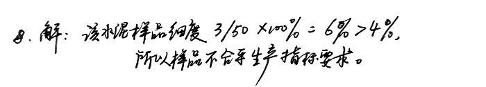 8、某廠水泥樣品50g,經0.08mm方孔篩篩析,達到規(guī)定時間所剩料量為3g,問該樣品是否合乎生產指標要求?(要求水泥細度<4%)